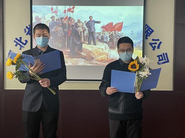 会议室经过消杀和一番布置后,成为简单不失庄严的活动现场。“这首词是毛泽东同志为赞扬黄洋界保卫战的胜利而写的,在1928年7月,湘赣敌军向井冈山发动第二次‘会剿’……”吕仕杰和杜金兴朗诵完毕后,舒缓刚才的激昂情绪,将黄洋界保卫战的故事娓娓道来,让大家感受到了黄洋界战场的残酷和井冈山军民抗战的英勇无畏。预算审计科郭文静、刘娟和法律事务科赵静共同朗诵了《蝶恋花·答李淑一》,声音婉转低沉,语速慢而稳,她们用女性特有的细腻和情感把毛泽东痛失爱人的悲伤之感表达出来。朗诵完毕,赵静讲述了毛泽东和杨开慧的相识相遇,以及杨开慧在狱中面对敌人开出的条件忠于革命信仰、忠于丈夫的故事。“我失骄杨君失柳”,一个“骄”字透露出毛泽东对杨开慧的无限思念和礼赞。预算审计科周荫、于翠霞、范丽娜共同朗诵《那一抹闪闪的秋色》,致敬革命烈士秋瑾;人力资源科科长左建华和党群办公室主任刘保国朗诵了陈毅将军的《梅岭三章》,并带大家回顾了陈毅带领队伍在梅岭被围时的生死瞬间;财务科高文婷、王昊贤和设备材料科白圣哲的一首《满江红》,让我们穿越时光感受宋朝岳飞精忠报国、一腔热血的英雄气概。