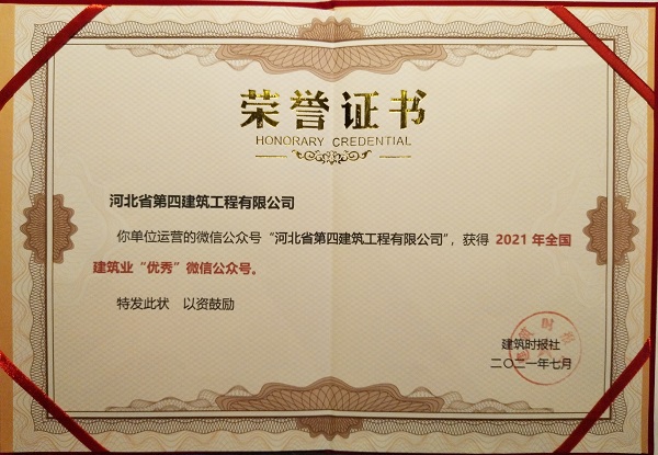 7月16日,在“2021建筑业微信公众号运维经验交流研讨会暨全国建筑业优秀公众号颁奖典礼”上,公司微信公众号“河北省河北四建有限公司”被评为“2021年全国建筑业优秀微信公众号”。