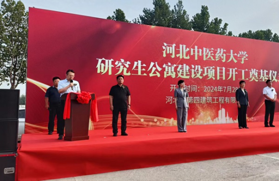 奠基仪式现场,挖掘机、装载机身披大红花整齐排列,犹如即将出征的战士,工人整装待发,信心满满、斗志昂扬。仪式在欢快激昂的乐曲声中拉开序幕。主持人首先介绍了参加本次仪式的相关领导和项目概况。随后,唐志强作为施工单位代表首先发言,“我公司有幸承接该施工任务,充分体现了项目主管部门和建设单位对我们国有建筑企业的信任和支持。河北四建一定高标准、严要求,为项目顺利实施提供有力保证,为业主提供满意服务,为河北中医药大学医学教育的高质量发展贡献力量!”最后,学校党委副书记孙士江表示,河北中医药大学研究生公寓为省政府支持骨干大学建设项目,希望参建各方全力以赴确保按时完工投入使用,建设“品质工程”“一流工程”,促进学校各项事业取得新成就,为经济强省、美丽河北建设作出新的更大贡献!